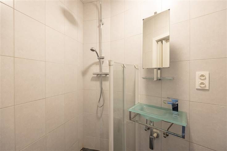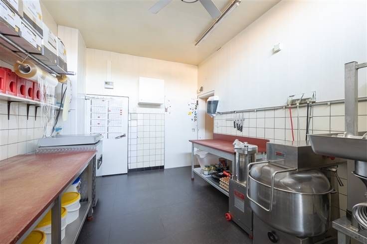 Aan de voorzijde vinden we de winkelruimte terug welke op heden mooi ingericht is. Achterliggend is er een koelruimte en atelier wa e bereidingen kan maken. Naast het atelier is er een volledig geïnstalleerde keuken voorzien uitgerust met allemaal kwalitatieve toestellen. Via een veiligheidsdeur in de traphal betreden we de privé vertrekken welke vandaag verbonden zijn met het handelspand. Er is een mooie leefruimte, kleine badkamer met lavabo, douche en toilet en een ruime slaapkamer aanwezig.