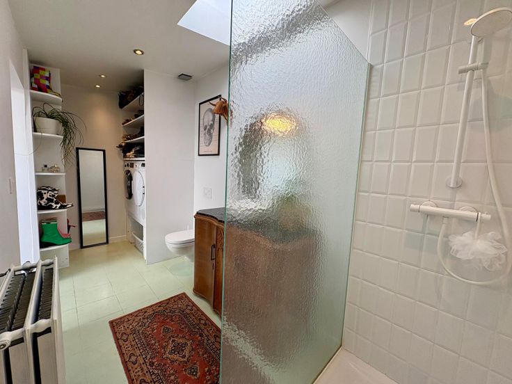 De badkamer werd in 2023 gerenoveerd met lichtkoepel, handige plek voor wasmachine/droogkast, ingebouwde kasten, WC & inloopdouche.