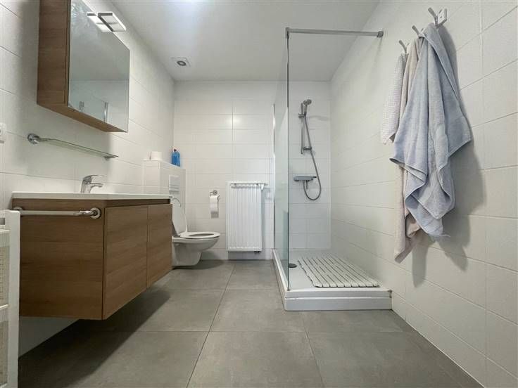 - Badkamer: inloopdouche, badmeubel met ingebouwde wastafel, medicijnkastje, ruimte voor wasmachine en hangend toilet.
