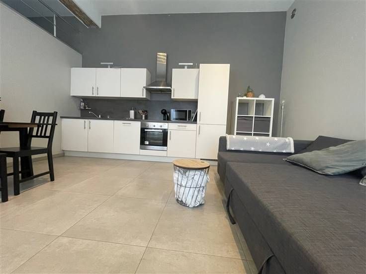 Het appartement bestaat uit: een inkomhal van 3,5 m², een grote, aangename en lichte woonkamer van 22,20 m² die uitgeeft op een volledig uitgeruste open keuken, een slaapkamer van 12,20 m², een douchekamer van 6,50 m² met toilet en een mezzanine van 6,50 m². Privé garage met sectionale deur.