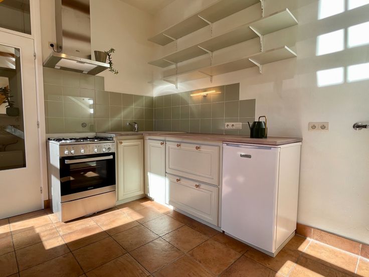 - gelijkvloers : Ingerichte keuken met gasfornuis, oven, dampkap, koelkast