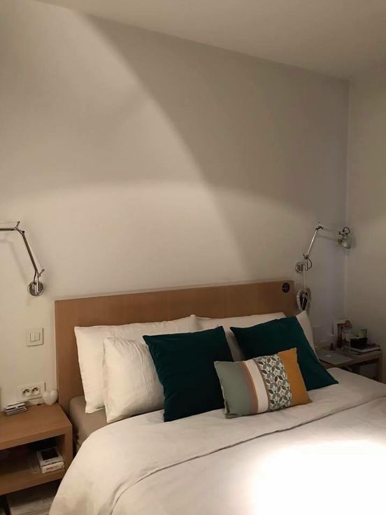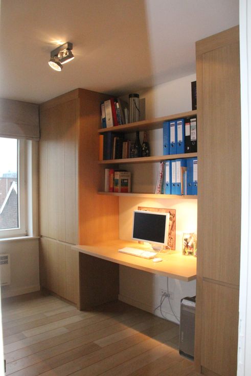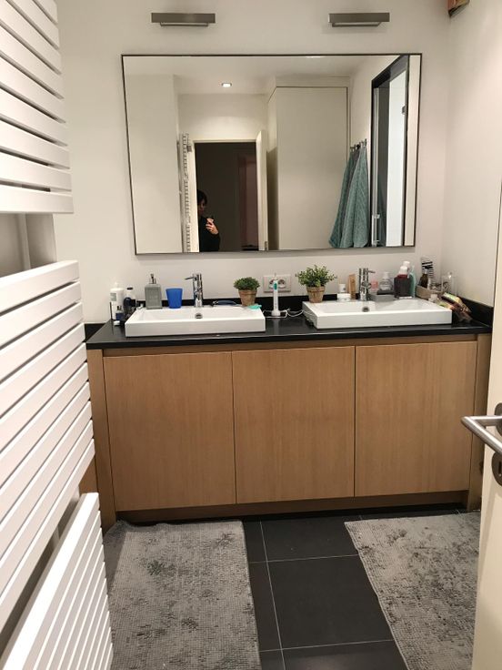 Appartement semi-meublé. Salon: meuble télé et étagères. Chambre 1: commode à tiroirs, cadre et tête de lit (1m60), tables de nuit, grand dressing, bibliothèque, étagères. Chambre 2: bureau, étagères et deux grands dressings. Couloir: armoire-vestiaire. Rideaux et stores.
