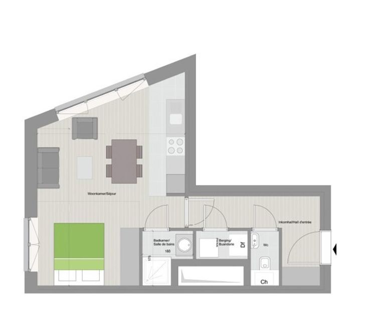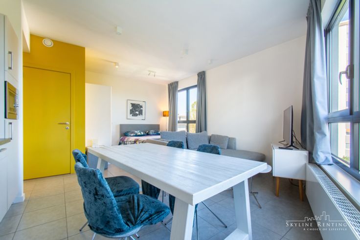 MAG C5.2 - Ideaal gelegen op 5 minuten van de NAVO, dicht bij de luchthaven, de Ring en winkels, biedt deze prachtige gemeubeld penthouse studio van ongeveer 45 m² een inkomhal, een ruime woonkamer met volledig uitgeruste keuken en slaaphoek, een wasruimte en een douchekamer. Een kelderberging is inbegrepen. Een ondergrondse parkeerplaats is verplicht voor €23.000. Gelegen op de bovenste verdieping van een modern gebouw (2016) met 5 verdiepingen. Momenteel verhuurd voor €950 + kosten. Een uitstekende investeringsmogelijkheid met gegarandeerd rendement. De hoogwaardige appartementen zijn voorzien van kwaliteitsmeubilair en afwerkingen. Het complex wordt voornamelijk bewoond door expats.