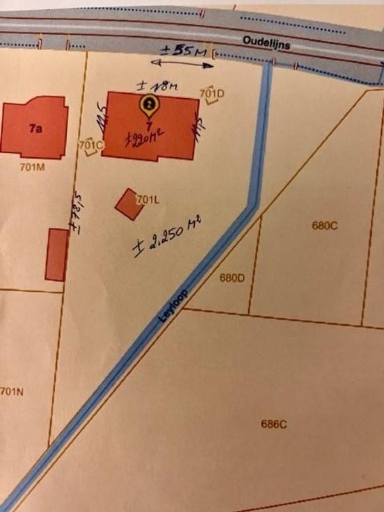- Bouwdiepte > max. 17,00 m (indien mogelijk, perceel loopt schuin en paalt aan een waterloop, hiervan dient een bouwvrije strook van 5,00 m te worden voorzien)