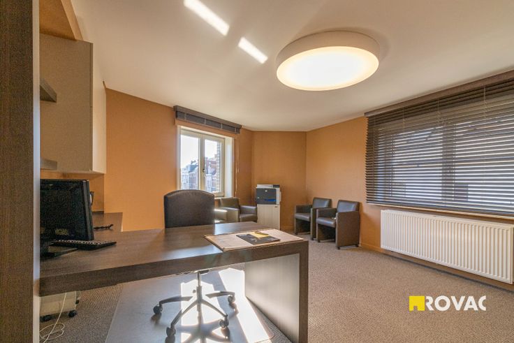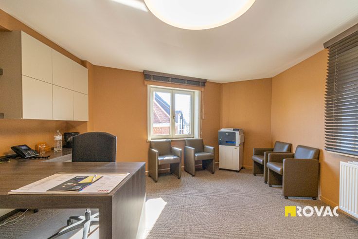 Centraal gelegen en energiezuinig (EPC : label B) kantoorgebouw voorzien van grote etalage op de hoek van het gebouw. Het gebouw bestaat op het gelijkvloers uit een ruime inkom, apart toilet, 2 kantoorruimtes, een grote vergaderzaal en een berging. Op de 1ste verdieping is er een hal met apart toilet, grote kantoorruimte, ingerichte keuken, berging en dakterras. Boven de vergaderzaal is er een archiefruimte voorzien met berging. Op de 2de verdieping is er een hal met apart toilet, 3 kantoorruimtes en een badkamer voorzien van ligbad, douche en 2 lavabo's. Grote geïsoleerde zolder te bereiken met een vaste trap. Kelder is aanwezig. Er is een lift en trappenhal voorzien in het gebouw. Alle kantoorruimtes zijn ingericht met bureel en ingemaakte kasten. Bruikbare vloeropp. volgens EPC : 399 m². Verwarming : CV op aardgas. Het gebouw is voorzien van airco. Ref. : 9225.