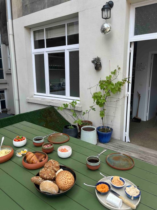 Een gezellig, oostgerichte terras. Met 'tuinhuis' waar je veel extra materiaal kwijt kan.