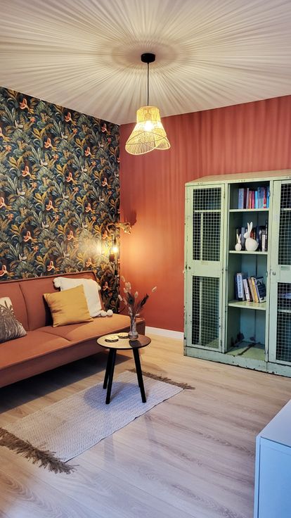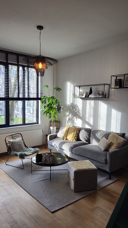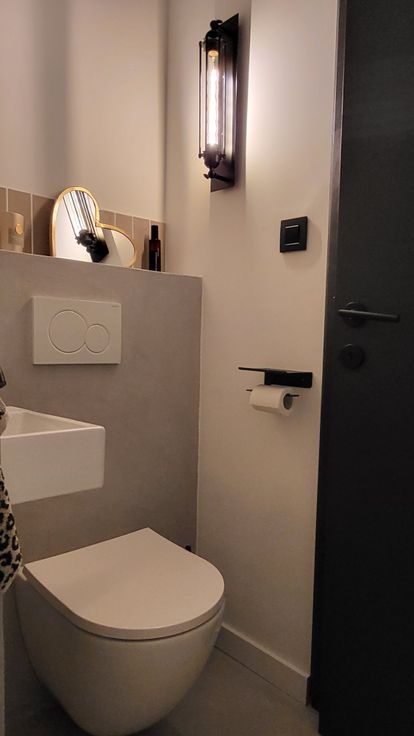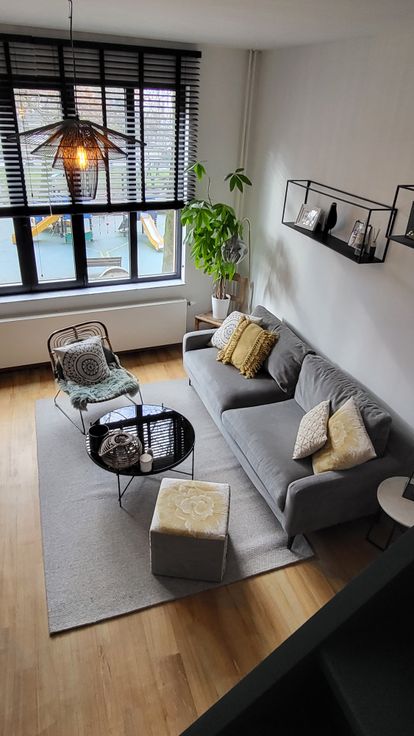 +1: badkamer met toilet, handenwasser en vrijstaand ligbad. Gezellige woonkamer met bureauhoek onder de trap.
