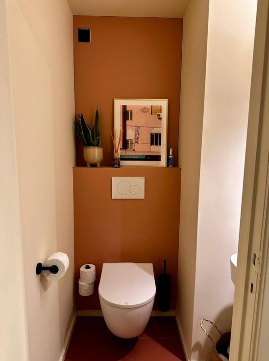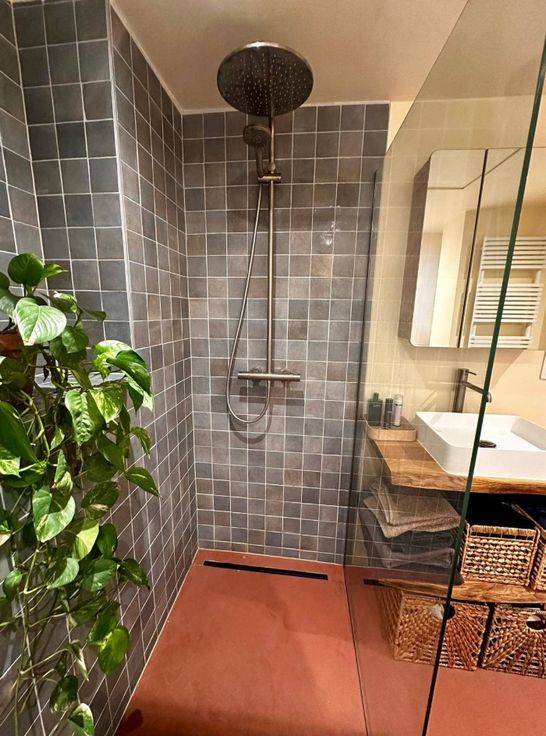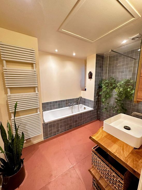 Het appartement beschikt over een ruime badkamer met ligbad en inloopdouche, met daarnaast een apart toilet. Verder in de gang is ook een wasruimte voorzien.