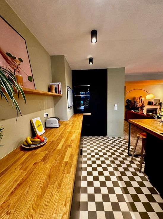 Verder heeft het twee slaapkamers, een grote inkomhal waaraan meteen een bureau met standingdesk grenst, en een zonovergoten leefruimte met een open hyperuitgeruste keuken, waar gebruik werd gemaakt van hoogwaardige materialen en toestellen.