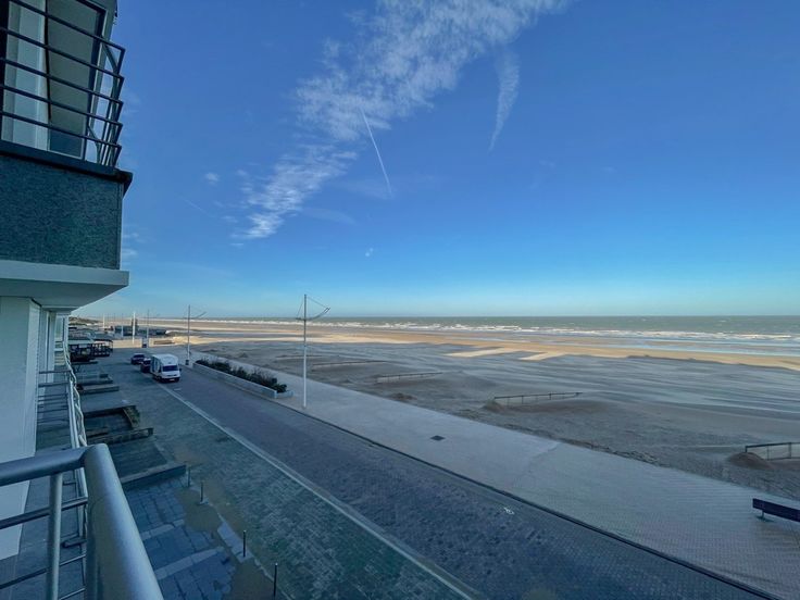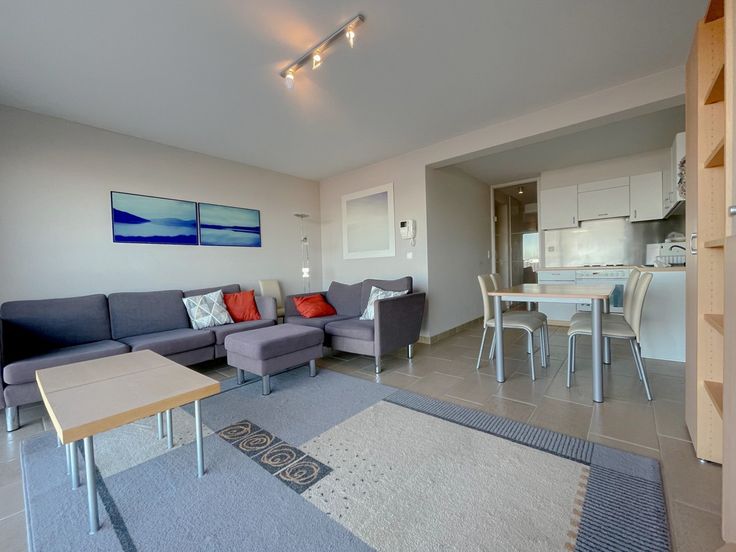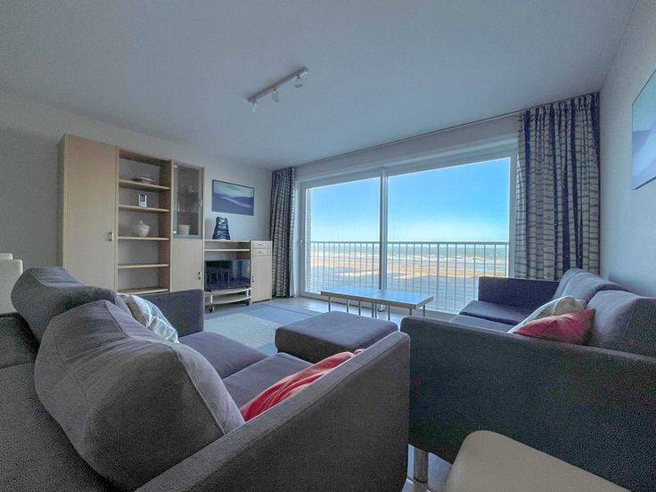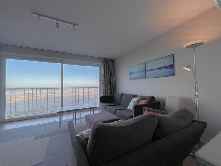 De woonkamer met schuifraam biedt een mooi zeezicht, een comfortabel salon en eethoek. De open keuken is functioneel ingericht.