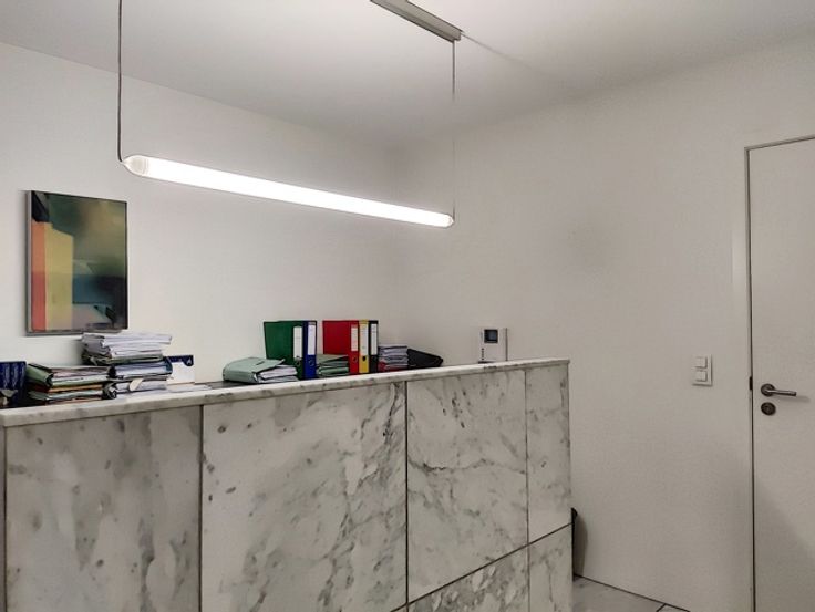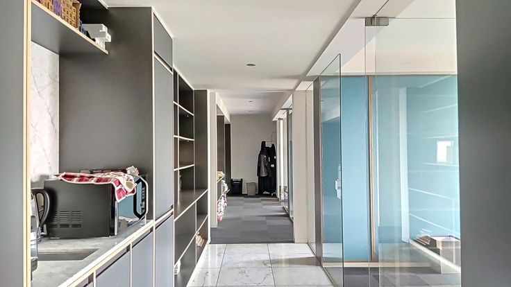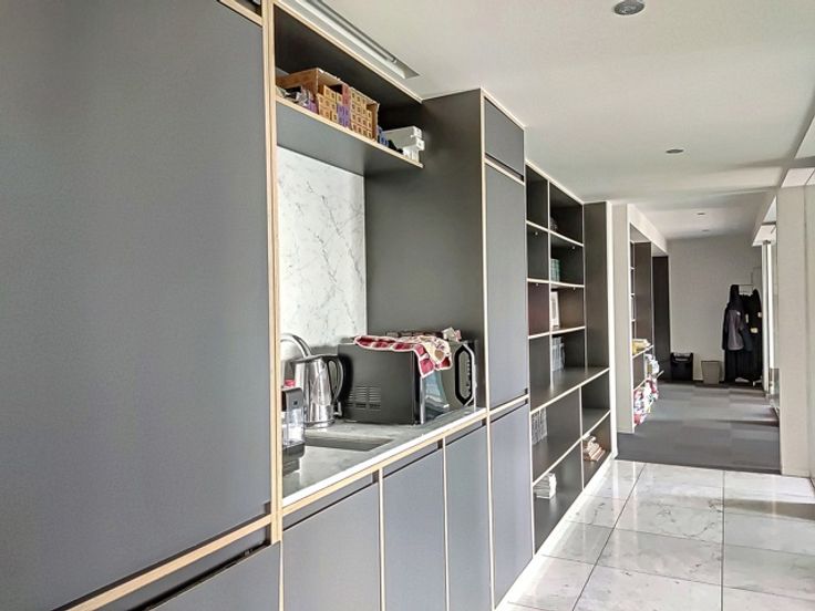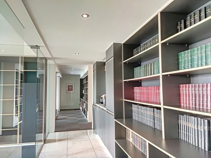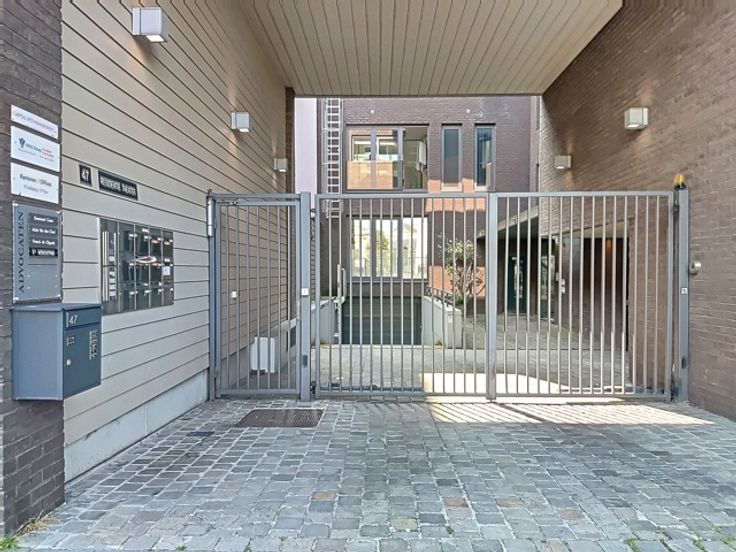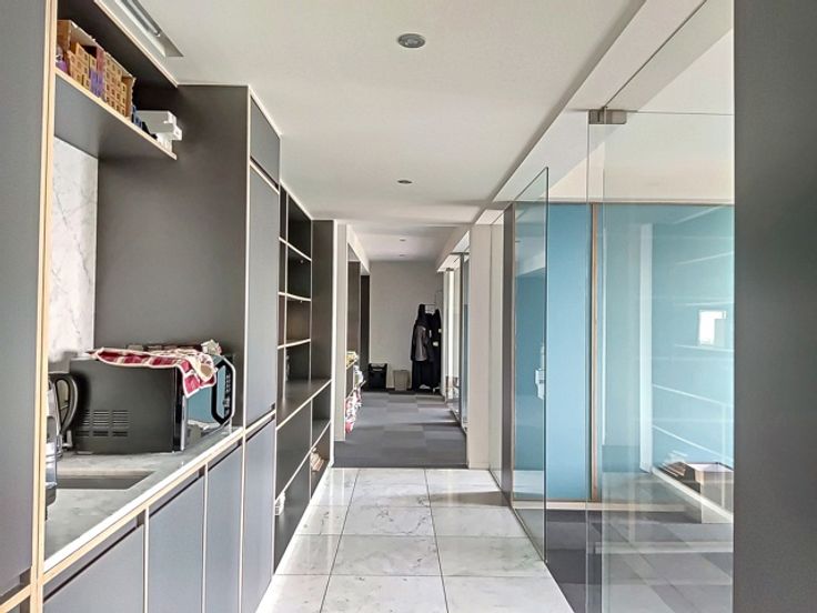 Het interieur is afgewerkt met duurzame materialen en voorzien van ingebouwde kasten, wat zorgt voor een stijlvolle en functionele werkomgeving. Daarnaast beschikt het kantoor over een volledig uitgeruste keuken en twee bergingen. De grootste berging doet momenteel dienst als kopieerruimte, terwijl de kleinere berging is ingericht als technische ruimte. De sanitaire voorzieningen bevinden zich op de gang.