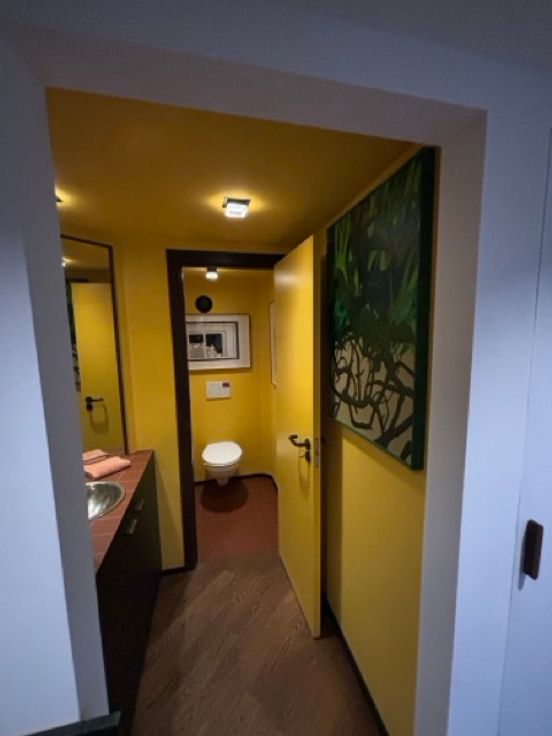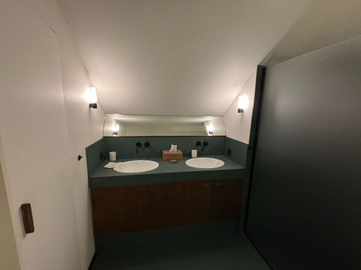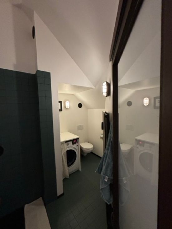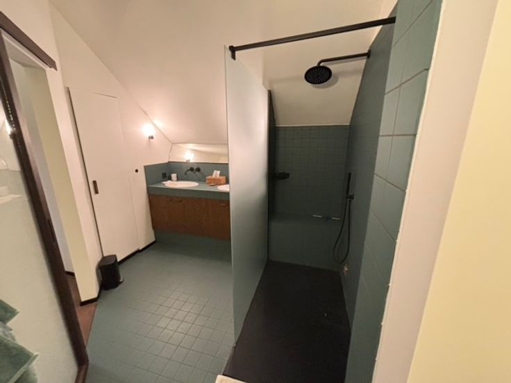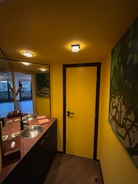 Cuisine américaine équipée, belle salle de douche à double évier avec lave-linge.