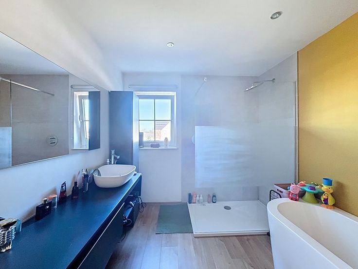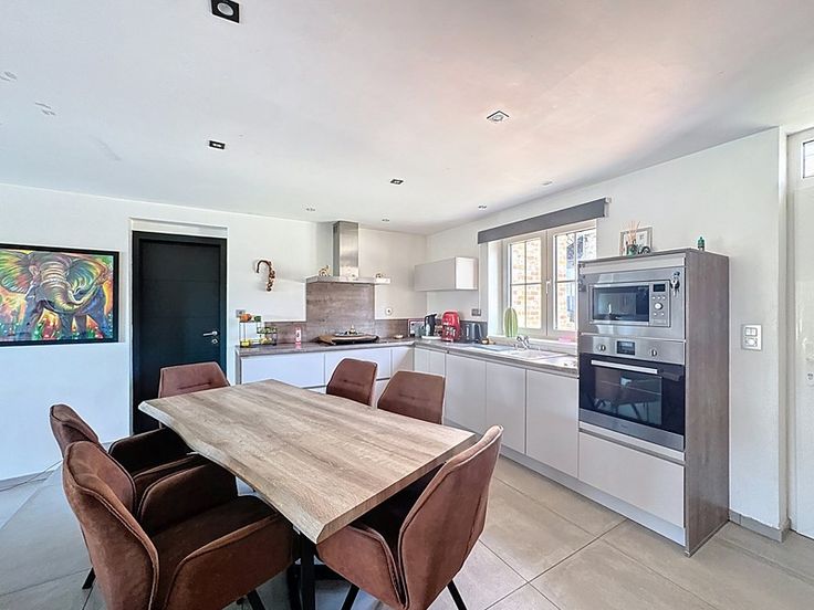*Rez-de-chaussée : hall avec vestiaire, wc séparé, spacieux et lumineux living de 40m² avec cuisine équipée ouverte, salon de 15m², buanderie et garage de 21m².