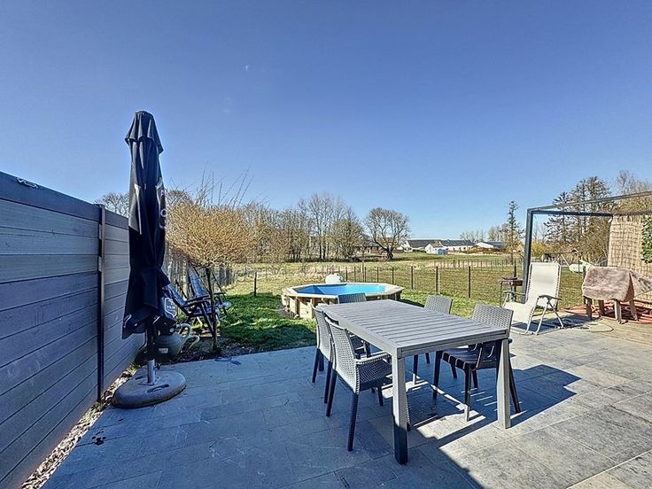 A l'extérieur, vous profiterez d'une grande cour avant facilitant le parking ainsi que d'une belle terrasse donnant sur le jardin offrant une vue dégagée sur les prairies arrières.