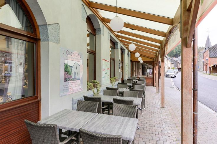 Gelijkvloers : ruime verbruikszaal (85 m²) tot 60 zitplaatsen (met bar en houtoven voor het klaarmaken van pizza), voorzieningen, groot buitenterras (60 zitplaatsen), professionele keuken die eveneens bereikbaar is via een paralel lopende straat. Eerste verdiep : 3 mooie kamers, 3 badkamers, kantoor, grote opslagruimte (38m²) boven de keuken. Tweede verdiep : 4 mooie kamers en een badkamer. Derde verdiep : 4 mooie kamers en een badkamer. Ondergronds : ruime kelder. Verkoop van aandelen of traditionele verkoop. Verkoopsvoorwaarden op het nummer +32.470.19.40.56.
