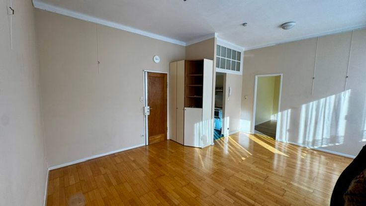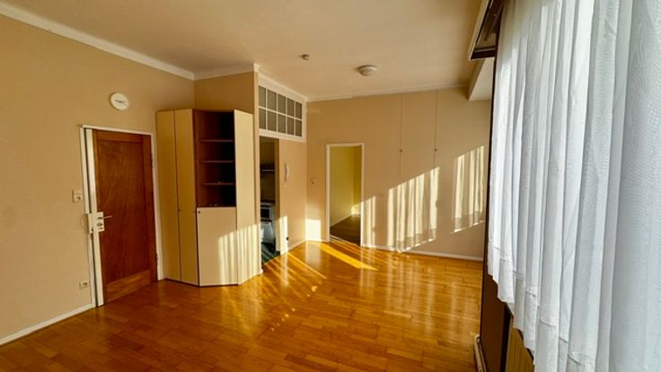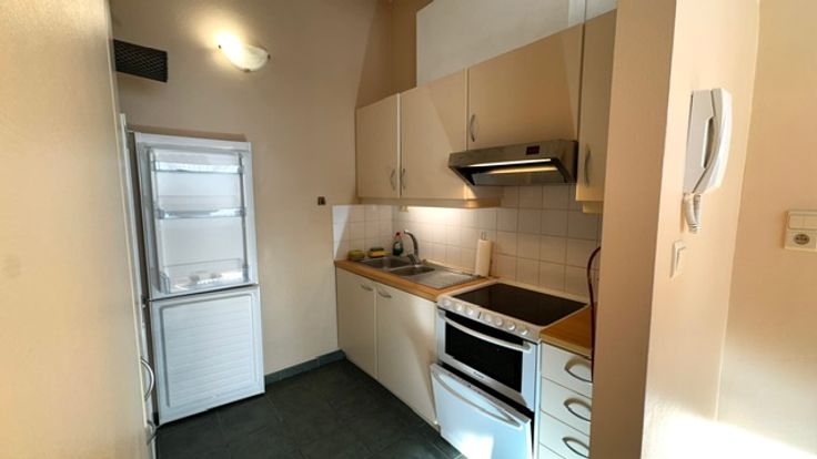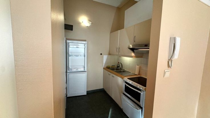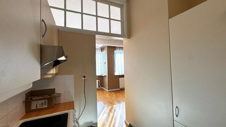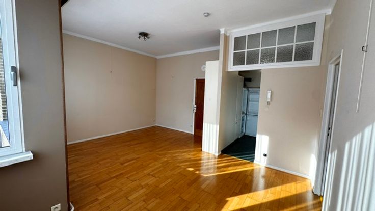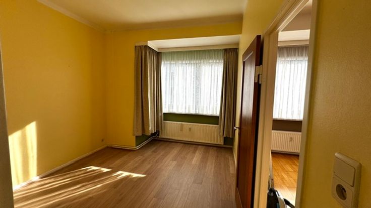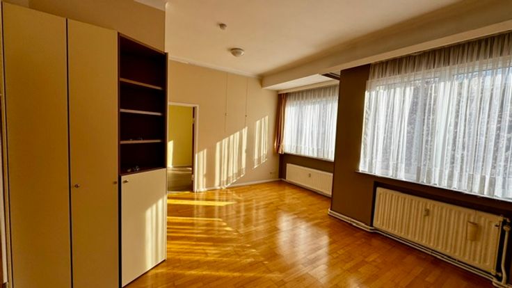 Ruime living met bergkast, ramen met gordijnen en overgordijnen plafond verlichting , parket keuken met grote koelkast, Stortbad met kast , Kemder en wasplaats voor wasmachine en droogkast