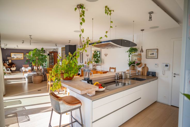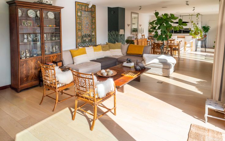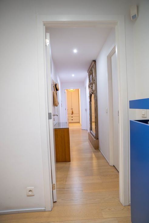 Dès l’entrée, un vaste hall avec vestiaire mène à un séjour baigné de lumière, idéal pour recevoir. L’espace salon, équipé d’un écran de projection, s’ouvre sur une salle à manger conviviale et un bar. La cuisine Bulthaup ouverte, entièrement équipée (fours vapeur, micro-ondes/chaleur tournante, induction, machine à café intégrée…), complète cet espace de vie élégant et fonctionnel.