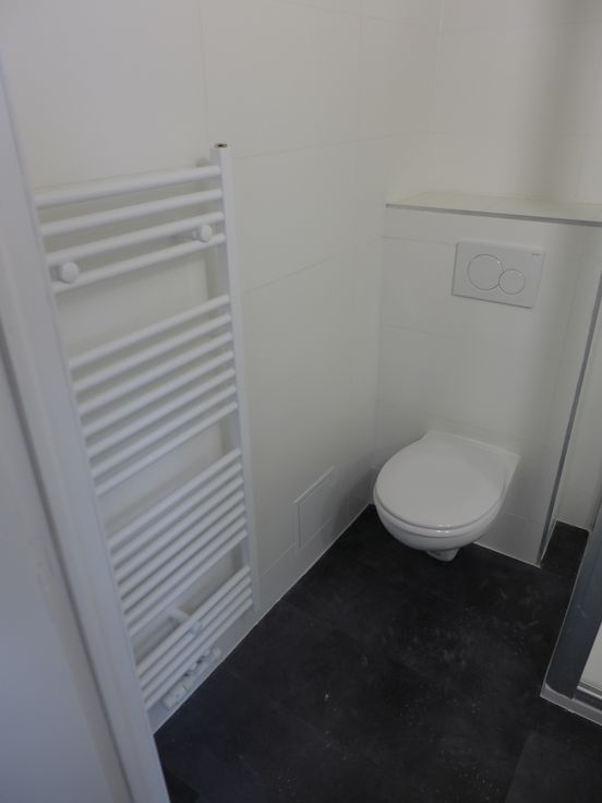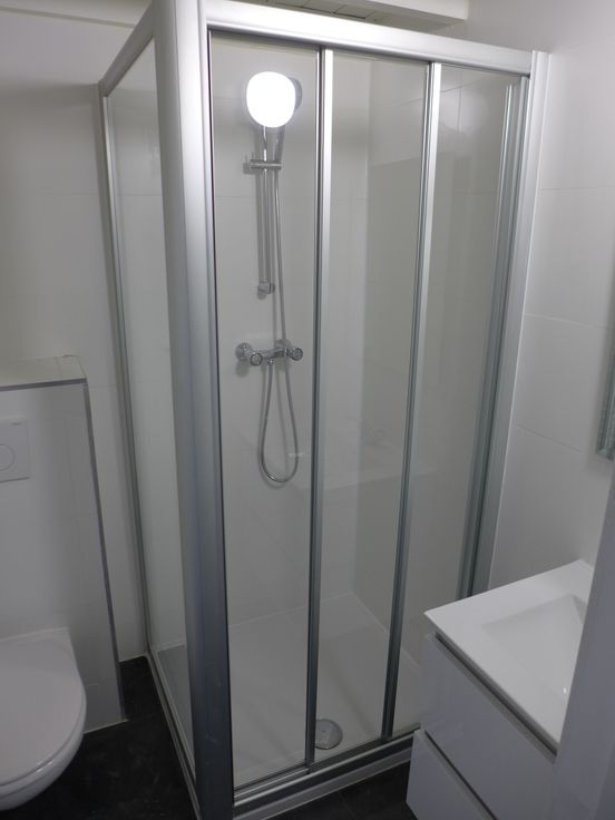 Une pièce principale avec coin cuisine semi équipée (taque électrique, hotte, frigo, évier et meubles), salle de douche et WC.