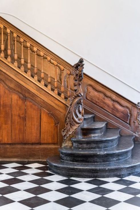 Respectvolle renovatie met behoud van authentieke elementen (tegelvloeren, houten trap, pleisterwerk)