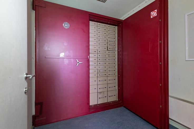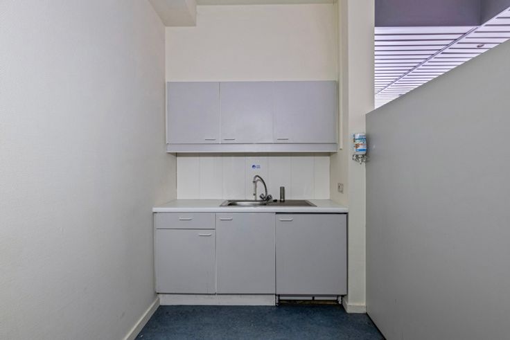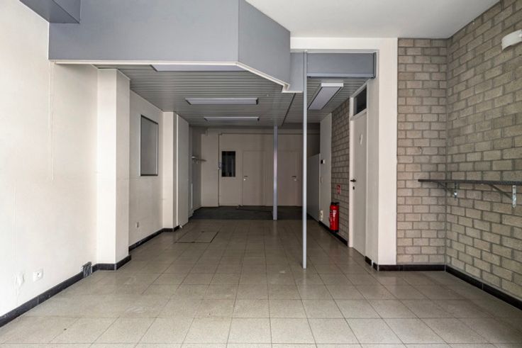 gelijkvloers: handelsruimte (66m²) bestaande uit een ruime kantoorruimte met afzonderlijk kantoor, keuken, kluizenzaal en toilet.
