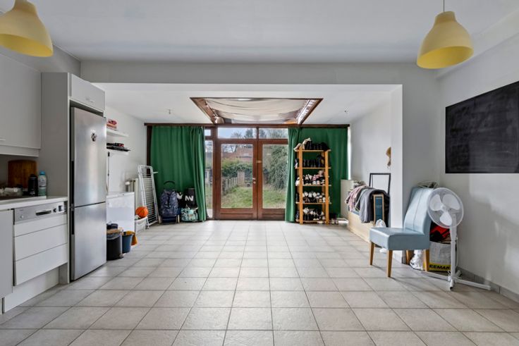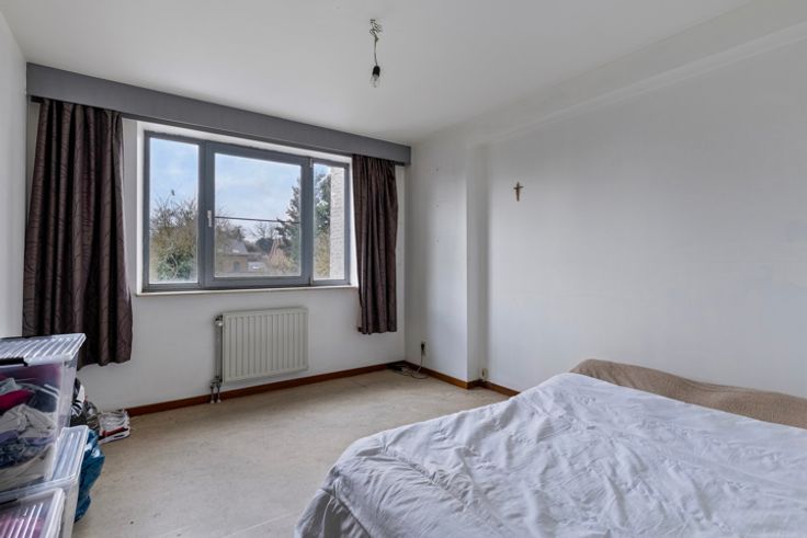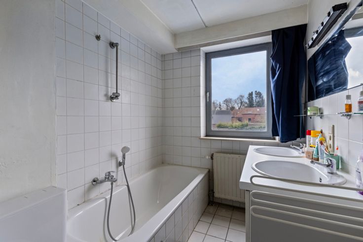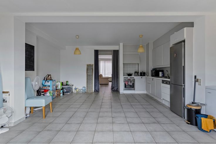 1ste en 2de verdieping: duplex appartement (106m²) bestaande uit een inkomhal, lichtrijke woonkamer, open keuken met toegang tot terras en tuin (Z). Op de verdieping is er een nachthal, 2 grote slaapkamers en badkamer.