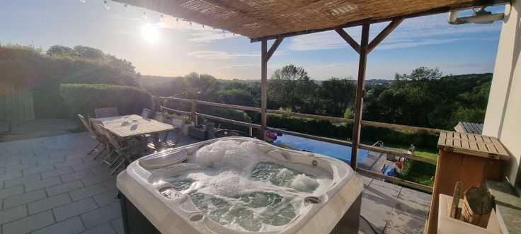 Le logement donne sur une grande terrasse de 50m2 où se trouve également le jacuzzi (sous un carport).
