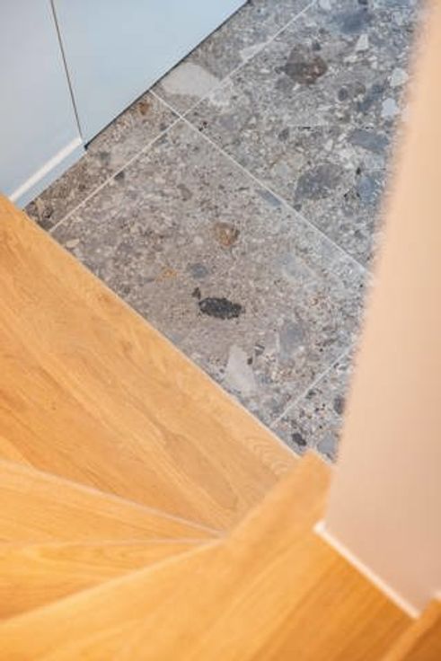 Deze woning heeft op het gelijkvloers een ruime inkomhal met bureel-/hobbyruimte, een apart toilet, een badkamer, een zeer ruime slaapkamer met zicht op terras en stadstuin. Op het eerste niveau bevindt zich de zithoek met open ultra-moderne keuken die naadloos overloopt op het grote terras vooraan met zicht over het water en de stad. De cosy zithoek situeert zich hier op de tweede verdieping waar zich ook de tweede slaapkamer mét badkamer en een apart toilet bevindt. De masterbedroom met dressing en derde badkamer liggen helemaal bovenaan en kijken uit op het derde mega-terras van waar je een zicht hebt over gans Geraardsbergen. Er is veel bergruimte voorzien en een garage die rechtstreeks toegankelijk is vanuit de woning via een achterdeur naar de grote berging.