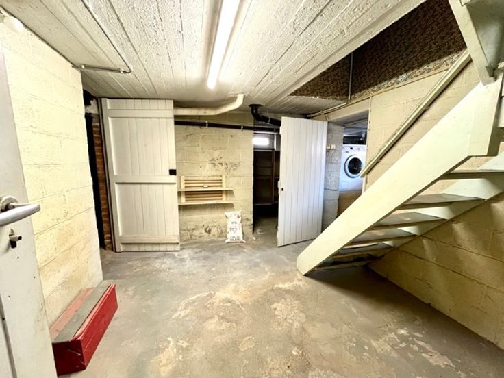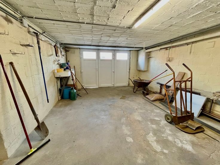 Begane grond: garage van 23m², kelders, bijkeuken en stookruimte.