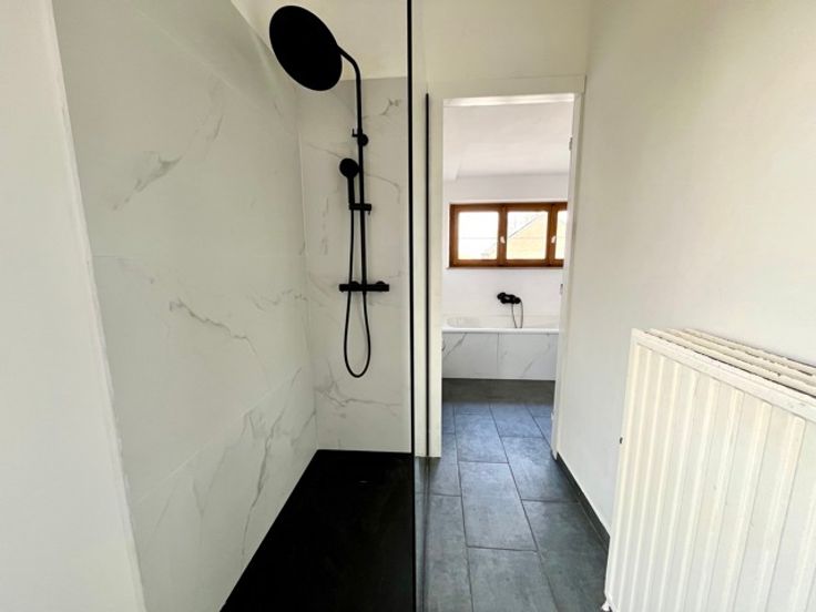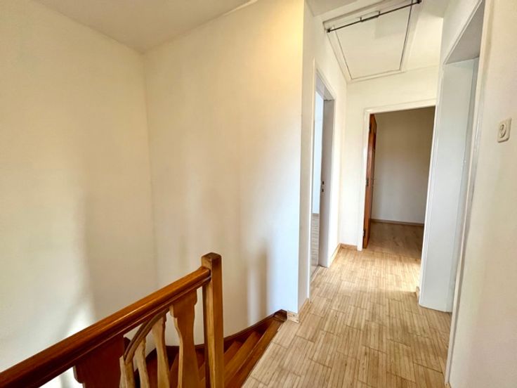 2e verdieping: nachthal, 3 slaapkamers (11, 16 en 16m²) en nieuwe badkamer (Italiaanse douche, bad, enkele wastafel en bergruimte).