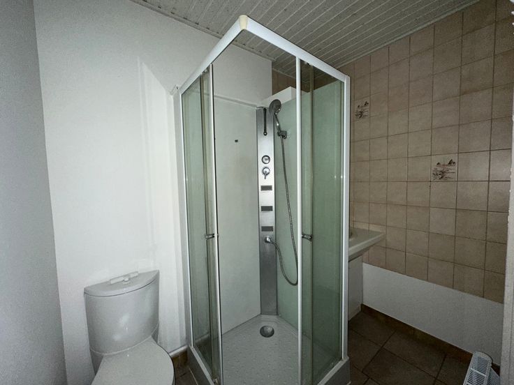 De badkamer is functioneel ingericht, met een douche, lavabo en toilet. Alles is voorzien voor uw dagelijkse comfort en gemak.