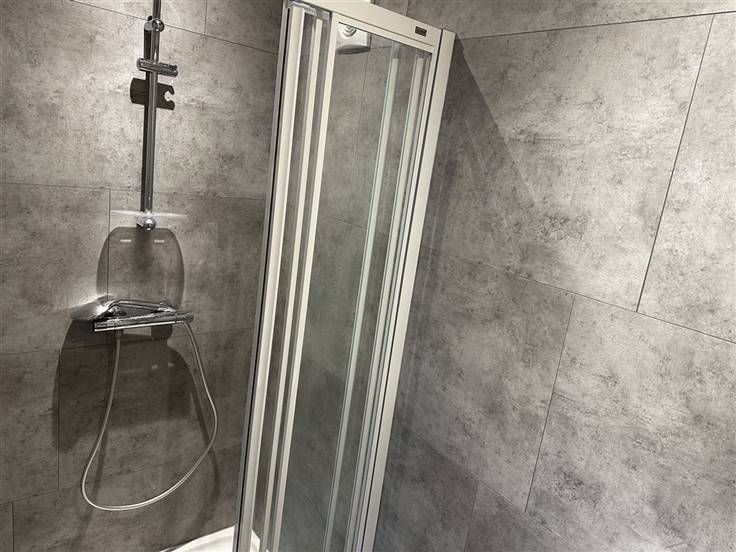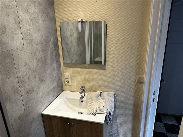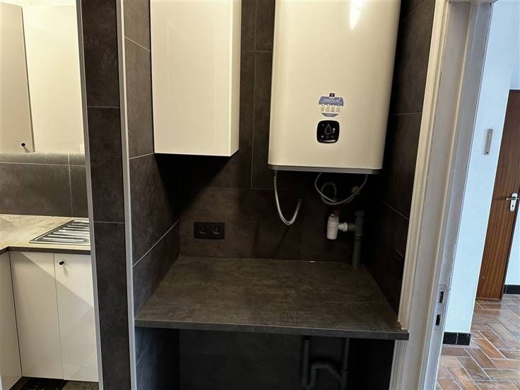 A l'étage, se trouve un salon de 19m² avec accès à un balcon de 6m², une cuisine équipée entièrement neuve ( taque, hotte, évier, nouveau frigo avec partie congélateur, meubles de rangement, installation machine à lessiver), une chambre et une salle de douche rénovée (douche, un meuble évier et un miroir).