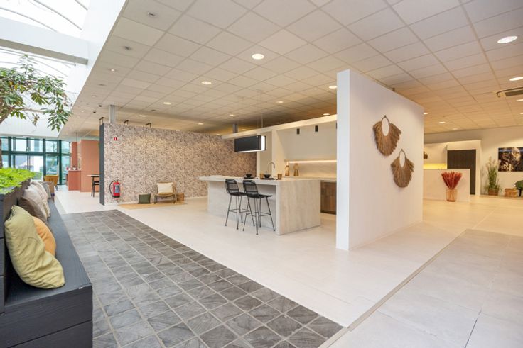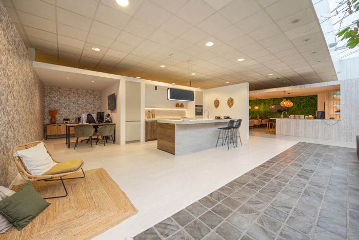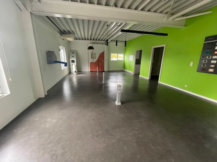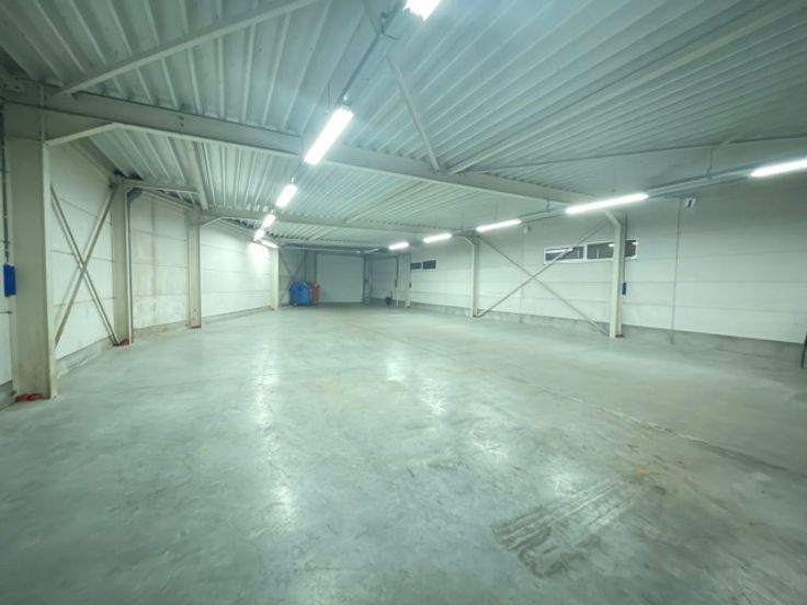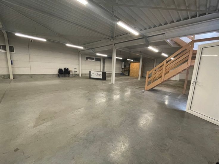 Het tweede gedeelte bestaat uit een magazijn dat beschikt over een grote sectionale poort, die toegang geeft tot het ruime magazijn met een hoogte van 3,2 meter . Boven bevindt er zich een grote vergaderruimte alsook 2 kleinere ruimtes, in te vullen conform eigen noden. Verder bevindt er zich een kleine keuken en 2 toiletten.