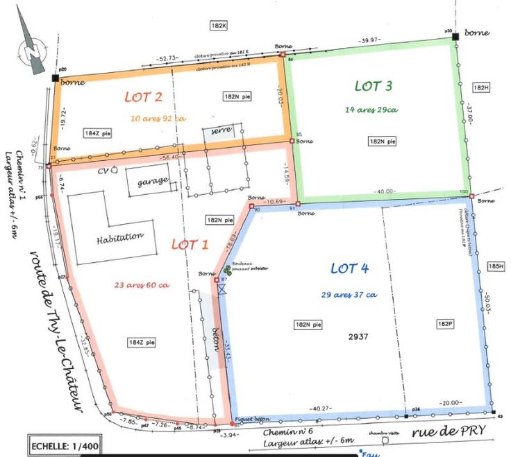 Un terrain cadastré au lieudit « Rij dem Sou » et rue de Pry, le long de la route de Thy-le-Château, section B 513D P0000 (partie du n° 182N P0000 et partie du n° 182P P0000) pour une contenance mesurée de 29 ares 37 centiares Le terrain est situé en zone d’habitat à caractère rural et en partie en zone agricole