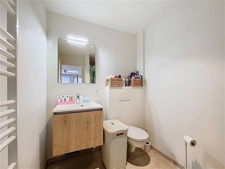 Op de eerste verdieping kom je de studio binnen in een kleine inkomhal. Daarachter ligt het leef gedeelte, waar een aparte hoek voorzien is voor een bed met vooraan het woongedeelte. De volledig nieuwe open keuken bestaat uit een kookvuur, dampkap, combi-oven en een ijskast, en er is eveens een kleine toog om aan te eten. De badkamer heeft een lavabomeubel, een toilet en een douche.