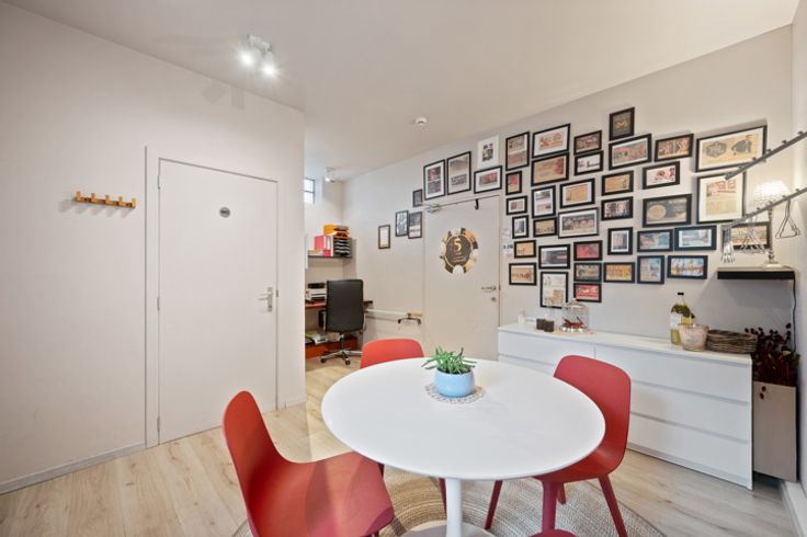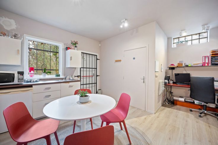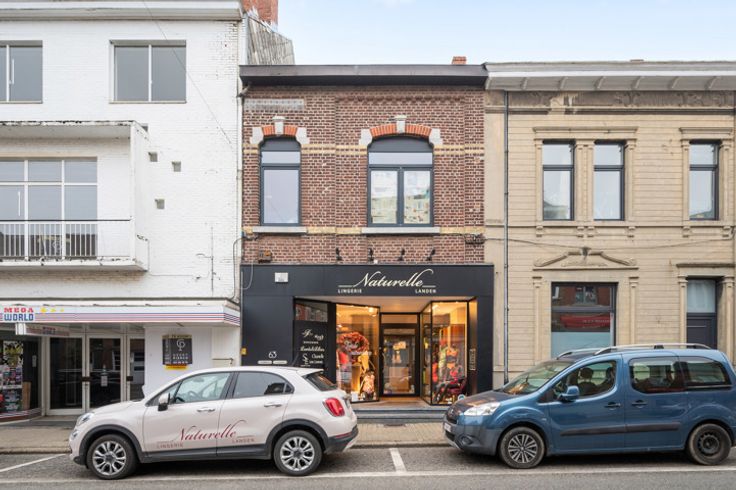 Het commerciële gedeelte is ingericht met vaste meubels, waardoor de ruimte meteen startklaar is. Je komt binnen in het eerste lichtrijke gedeelte van het handelspand dat ideaal is voor retail, showroom of kantoor. Verder in het pand bevindt zich een ruime pasruimte en helemaal achteraan bevindt zich een privé gedeelte met een kleine stockageplaats, wc, bureauruimte voor administratief werk en een praktische keuken. Tot slot beschikt het pand over een verborgen kelder, ideaal als extra opslagruimte.