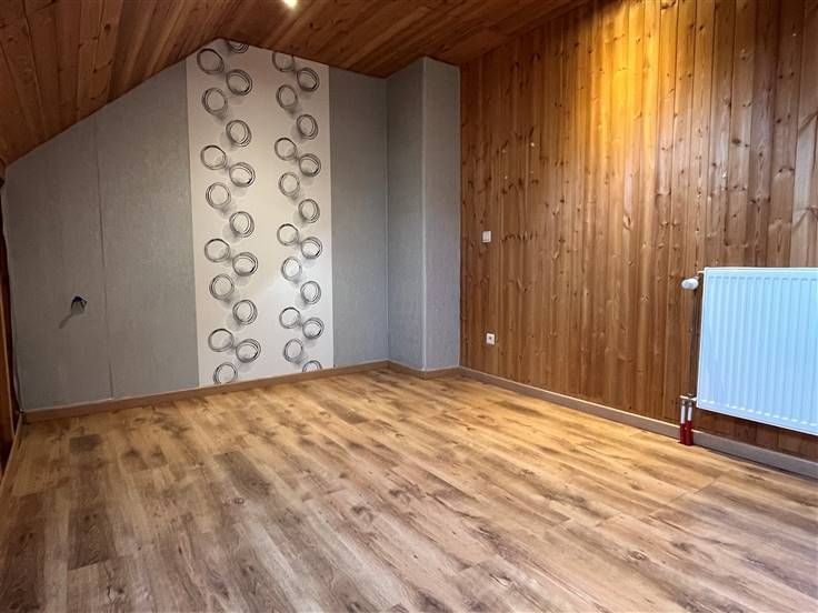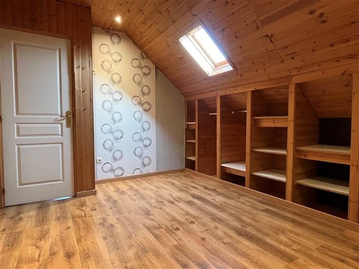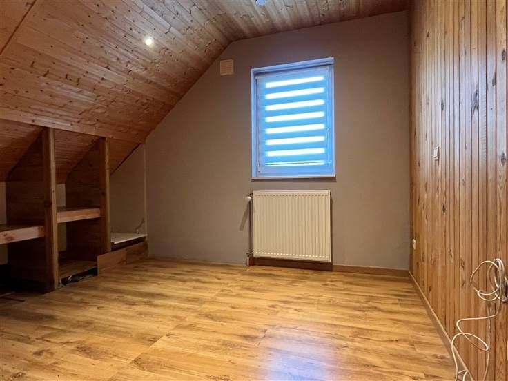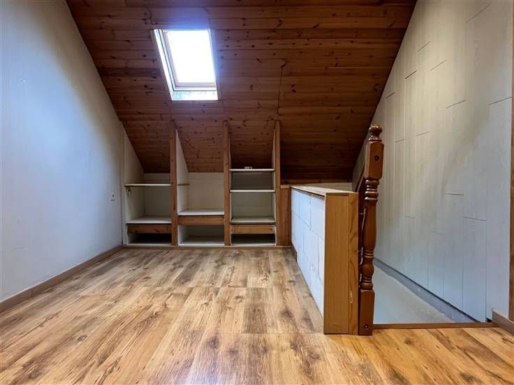 Op de verdieping een grote nachthal met bergruimte, een bureau van +/- 7m², twee slaapkamers met ingebouwde kasten van +/- 8,6 en 10m² en een kleine zolder.