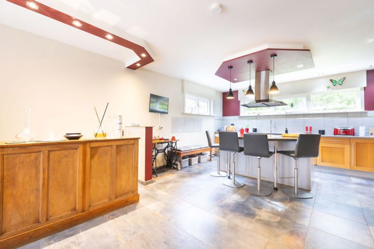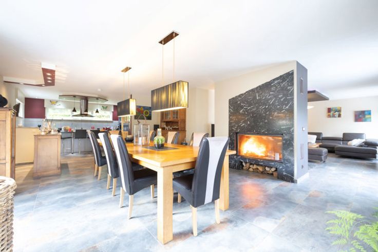 Au rdc : 160m² : un vaste hall d'entrée avec un vestiaire, un wc séparé, un magnifique séjour/sam de 68m² avec F-O (marbre), une belle cuisine ouverte super-équipée de 19m² avec îlot central, accès à la terrasse de 110m² (étang de 18m²), piscine de +- 30m² (sel), pool house et pac. Depuis le rdc, accès vers le garage et vers le bureau du 1er de 24m².