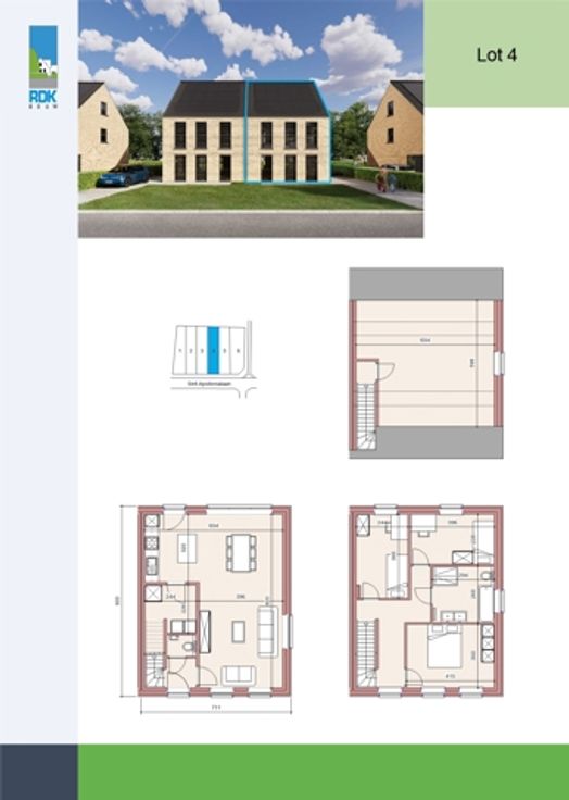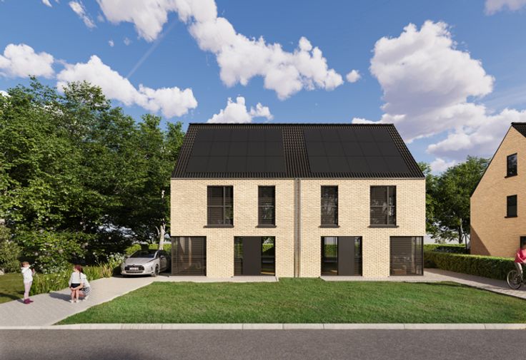 Aan de Sint-Apollonialaan in Mol zijn de werken gestart voor de bouw van 6 halfopen woningen met moderne architectuur, eigentijdse uitstraling en kwalitatieve afwerking. De ligging is één van de troeven: Een rustige omgeving met het centrum van Mol vlakbij. Energiezuinigheid staat voorop: Warmtepomp, vloerverwarming, zonnepanelen, ... waardoor u een maximaal Epeil van 10 krijgt. Snelle beslissers genieten van een lanceringsactie: Gratis laminaat in de slaapkamers en nachthal OF extra afwerkingsbudget voor uw keuken! Huisnummer 153a (lot 4) bevindt zich op een ruim perceel van 470m² en kent deze indeling: Inkomhal met gastentoilet. De leefruimte krijgt langs 3 gevels natuurlijk daglicht binnen en is opgedeeld in een zithoek, eetkamer en compleet uitgeruste leefkeuken met toegang tot de berging en wasplaats. Op de 1e verdieping de hoofdslaapkamer, 2 kinder/logeerkamers, en de badkamer met ligbad, douche, toilet en meubel met dubbele wastafel. Een vaste trap brengt u de ruime zolder, ideaal voor extra slaapkamer(s) of hobbyruimte. De tuinen worden voorzien van een terras en worden ingezaaid met gras. Op de scheiding worden beukenhagen geplant. Vooraan wordt een oprit aangelegd, zodat u daar uw wagen(s) kan parkeren. De geadverteerde prijs is exclusief aankoopkosten (BTW en registratierechten). Inclusief kosten, komt de totale prijs op +/- 432.000 EUR. Inbegrepen is de afwerking zoals dit voorzien is in het lastenboek. Snelle beslissers hebben bovendien nog inspraak!