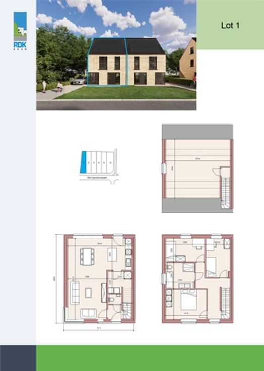 Aan de Sint-Apollonialaan in Mol zijn de werken gestart voor de bouw van 6 halfopen woningen met moderne architectuur, eigentijdse uitstraling en kwalitatieve afwerking. De ligging is één van de troeven: Een rustige omgeving met het centrum van Mol vlakbij. Energiezuinigheid staat voorop: Warmtepomp, vloerverwarming, zonnepanelen, ... waardoor u een maximaal Epeil van 10 krijgt. Snelle beslissers genieten van een lanceringsactie: Gratis laminaat in de slaapkamers en nachthal OF extra afwerkingsbudget voor uw keuken! Huisnummer 151 (lot 1) bevindt zich op een ruim perceel van 408m² en kent deze indeling: Inkomhal met gastentoilet. De leefruimte krijgt langs 3 gevels natuurlijk daglicht binnen en is opgedeeld in een zithoek, eetkamer en compleet uitgeruste leefkeuken met toegang tot de berging en wasplaats. Op de 1e verdieping de hoofdslaapkamer, 2 kinder/logeerkamers, en de badkamer met ligbad, douche, toilet en meubel met dubbele wastafel. Een vaste trap brengt u de ruime zolder, ideaal voor extra slaapkamer(s) of hobbyruimte. De tuinen worden voorzien van een terras en worden ingezaaid met gras. Op de scheiding worden beukenhagen geplant. Vooraan wordt een oprit aangelegd, zodat u daar uw wagen(s) kan parkeren. De geadverteerde prijs is exclusief aankoopkosten (BTW en registratierechten). Inclusief kosten, komt de totale prijs op +/- 421.000 EUR. Inbegrepen is de afwerking zoals dit voorzien is in het lastenboek. Snelle beslissers hebben bovendien nog inspraak!