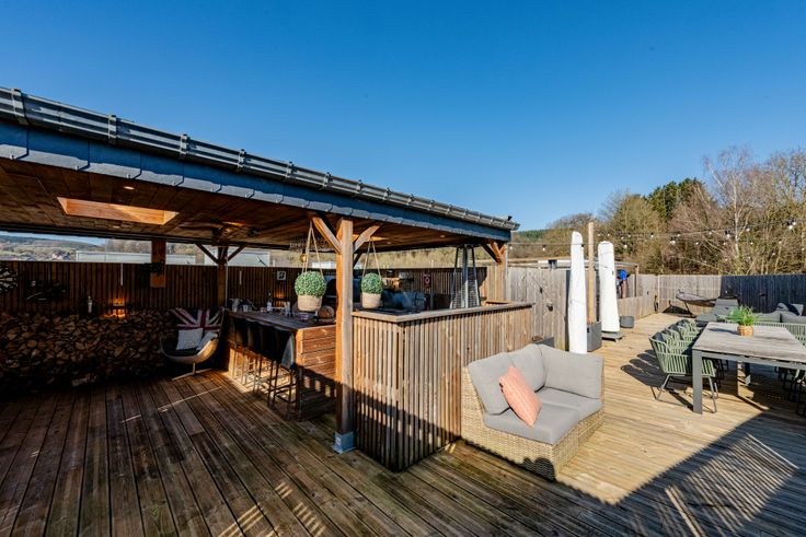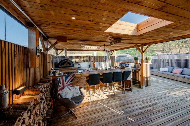 2ème étage: Passerelle, 1 chambre, cave à vins, cuisine extérieure (évier, frigo, micro-onde, four à pizza, friteuse), vaste terrasse avec piscine.