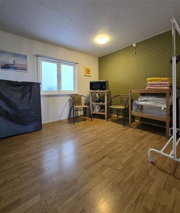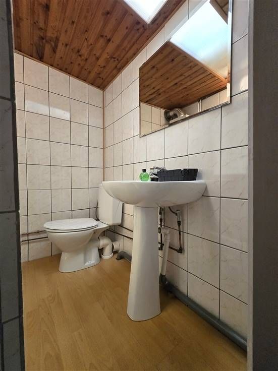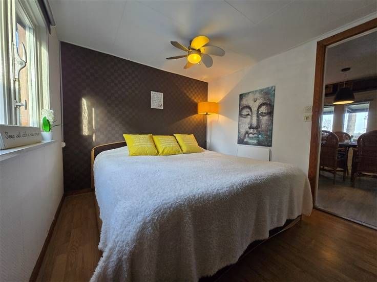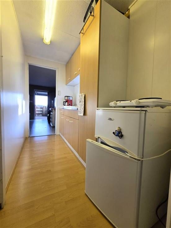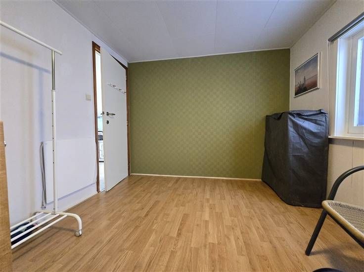 Bevat: Gezellige living met houtkahel, uitgevend op omheind en overdekt terras met ver uitzicht, slaapkamer 1 met 2 persoonsbed, slaapkamer 2 nog in te richten, keuken met kasten, badkamer met douche, lavabo met spiegel, toilet. Gasboiler op fles.