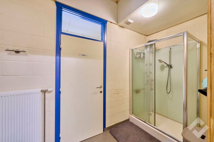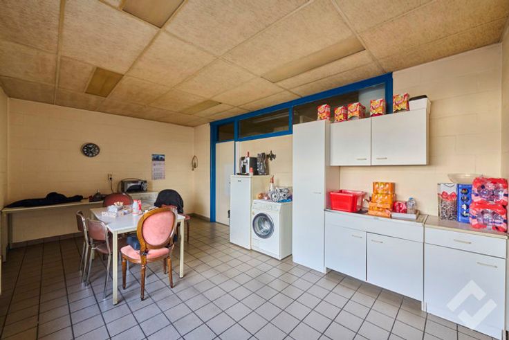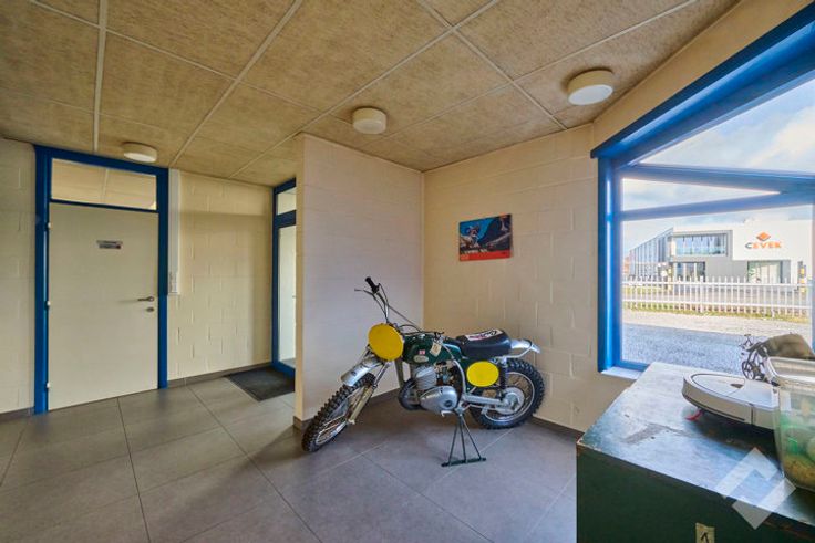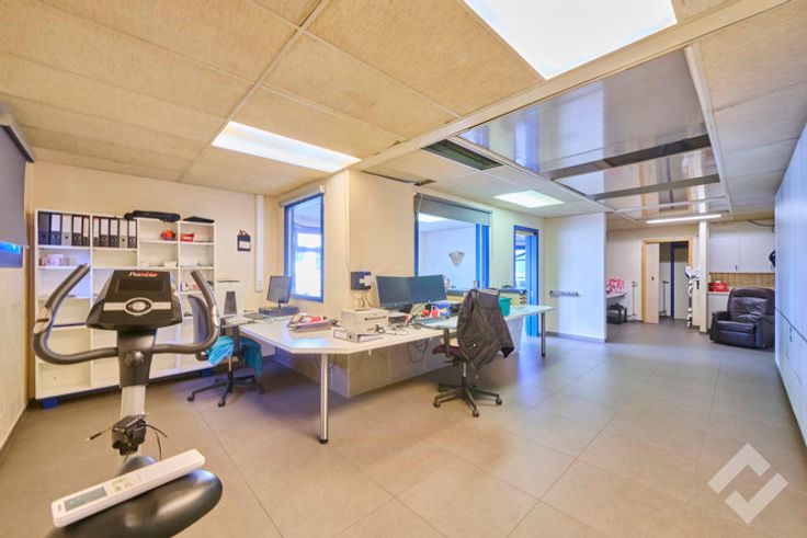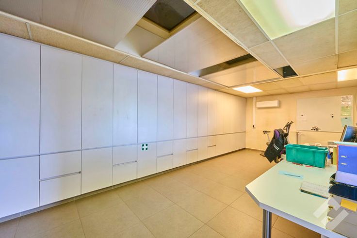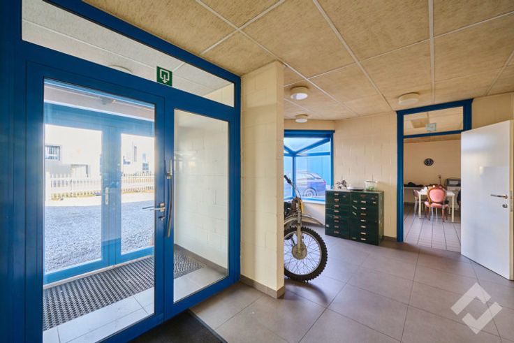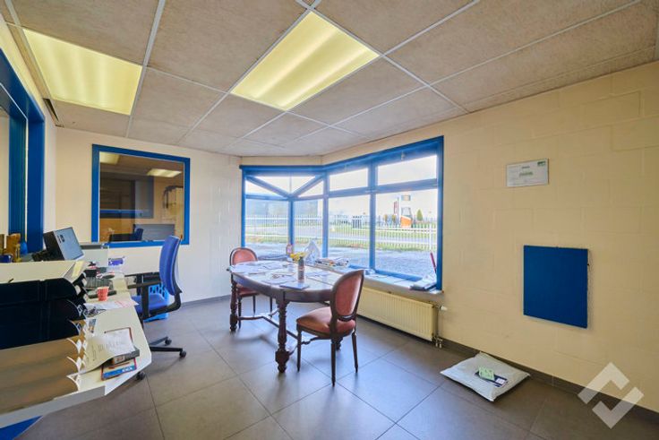 Vooraan bevinden zich de kantoren (148m2) met onthaalruimte en personeelsverzieningen zoals een lunchroom, sanitair en douche. Via een sas zijn de werk/opslagplaatsen te bereiken vanuit de kantoren.
