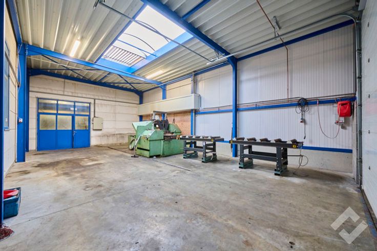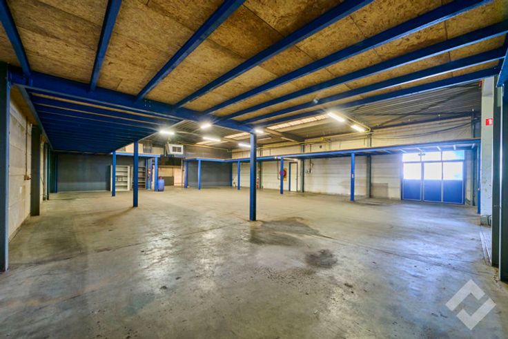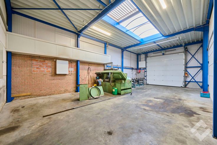 Het gebouw werd enkele keren uitgebreid waardoor de hallen gecompartimenteerd zijn, deze bestaan uit 4 werk/opslagplaatsen van 457m2, 405m2, 95m2 en 655m2. Voorzieningen zoals automatische sectionaalpoorten, gepolierde betonvloeren, stroomvoorzieningen 220V/380V, lichtstraten, edm zijn aanwezig. Er is een vrije hoogte van ca. 5,5m te bekomen, de grootste hal heeft een vrije hoogte van 6,5m. Het geheel werd opgetrokken in staalbouw waarbij de uitbreidingen werden afgewerkt met geïsoleerde panelen, het oorspronkelijke gedeelte bestaat uit kalkzandsteenmuren. Er is ook een verdiepingsvloer aanwezig met een werkatelier eronder.