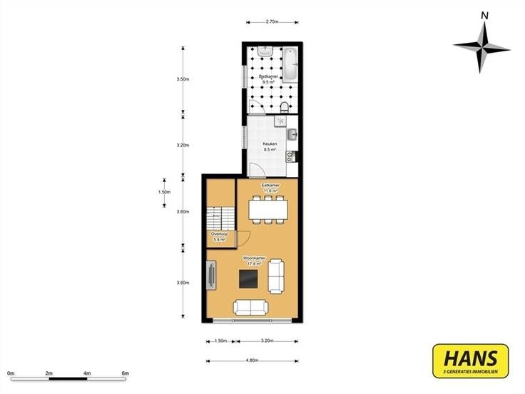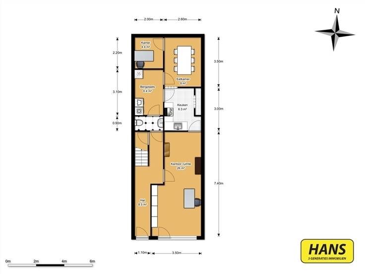 Instapklare woning (176 m²) met kantoorruimte op het gelijkvloers en 3 slaapkamers/ mogelijke bel-étage met 3 slaapkamers nabij Park Spoor Noord. Het pand situeert zich in een rustige straat in Borgerhout en kent een uitstekende mobiscore. Ze is gelegen vlakbij meerdere bus- en tramhaltes, alsook vélo-stations en daarbij situeert het Centraal Station zich op een kilometer. In- en uitvalswegen liggen een boogscheut. Momenteel is het pand ingericht als eengezinswoning met kantoorruimte op het gelijkvloers. Mits enkele aanpassingen kan het moeiteloos omgevormd worden tot bel-étage. Het gebouw beschikt over 2 ingangen: een toegang tot de woning en een tot het kantoor. Het gelijkvloers is ingedeeld in een kantoorruimte (26 m²). Achteraan is er een keukentje (6,3 m²) en verder zijn er nog 3 bergruimtes (totaal 22 m²) en een wc. Middels de trap in de inkomhal bereiken we een eerste tussenverdieping (2,5 m²). Op de eerste etage betreden we de L-vormige woonruimte (29 m²) met gevelbreed raam. Achteraan hebben we toegang tot de geïnstalleerde keuken (8,5 m²) en vervolgens tot de badkamer (9,5 m²). De tweede tussenverdieping (2,5 m²) beschikt over de mogelijkheid om een wc te installeren. Op de tweede etage bevinden zich de 3 slaapkamers (2 van 8,5 m² en 1 van 12 m²). Het dak werd gerenoveerd in 2012 en er is overal dubbele beglazing aanwezig. De centrale verwarming is op mazout. Er is een kelder. Voor meer info of een gratis schatting surf www.hansimmo.be.