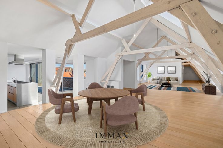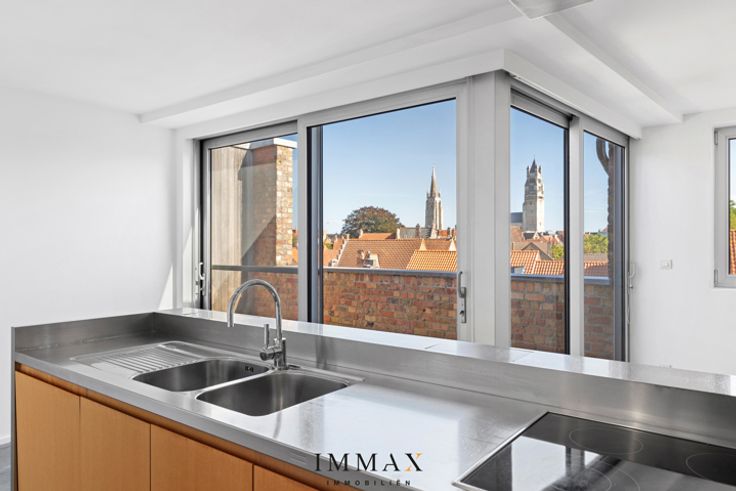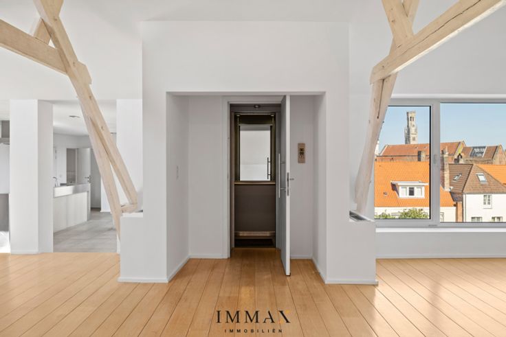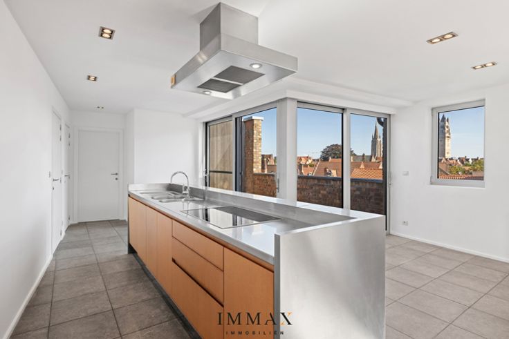 Op een unieke locatie in de Brugse binnenstad bevindt zich deze ruime, prachtig afgewerkte loft van 180 m² Een kleinschalig gebouw op een boogscheut van t Zand, de Markt en de omliggende winkelstraten, biedt de ideale uitvalsbasis voor wie op zoek is naar hedendaags wonen in de historische binnenstad. De loft beschikt over een ruime leefruimte voorzien van verschillende glaspartijen waardoor dit een uiterst lichtrijke ruimte is, de authentieke balken en haard brengen gezelligheid binnen. Een half open keuken met alle hedendaagse comfort biedt toegang tot een ruim zuidgericht terras (14 m²) met de meest unieke zichten over de Brugse binnenstad. Daarnaast bevindt er zich naast de keuken nog een ruime berging/wasberging en beschikt de loft over een badkamer voorzien van douche, ligbad en dubbele lavabo. De 2 slaapkamers hebben een praktische indeling en baden in het zonlicht. Troeven: - Rustige ligging op wandelafstand van commercieel centrum - Alle hedendaags comfort aanwezig (o.a. airco en lift aanwezig) - Veel ruimte en lichtinval - Zongericht terras - Optioneel: mogelijkheid tot bijkopen van een garagebox of dubbele garagebox met kelder Kortom een uniek loft appartement in de Brugse binnenstad met oog voor ruimte en design - zonder parkeerstress. Voor verdere informatie of vrijblijvend bezoek contacteer Wout op 0475 96 59 38 of mail naar wout@immax.be. * * * Deze eigendom wordt u aangeboden onder de verkoopmethode ‘startprijs’. Deze vermelde startprijs houdt b