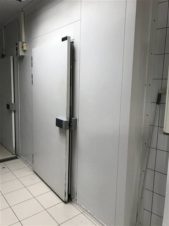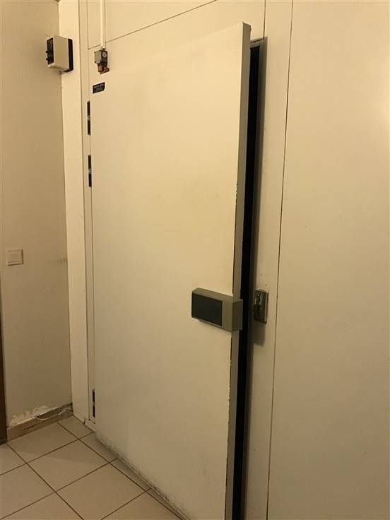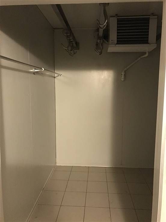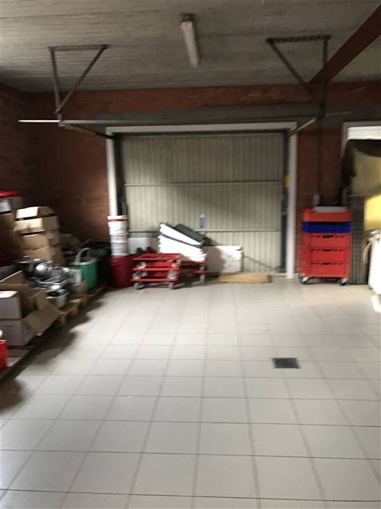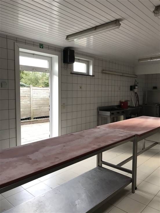 Winkelruimte, tussenruimte met bureelhoek, grote koelcel, ruime professionele werkruimte/keuken (met uitgang naar buiten), een 2de koelcel, grote diepvriescel, opslagruimte met garagepoort.