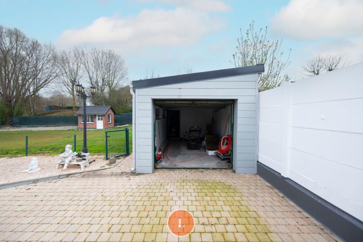 - Twee garages, waarvan één zeer ruime met achterliggende werkplaats