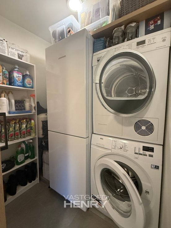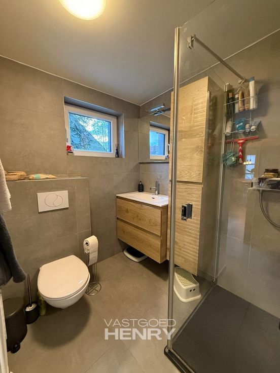 - Badkamer met douche en toilet, aanpalend aan een wasruimte voor de wasmachine en droogkast of extra frigo