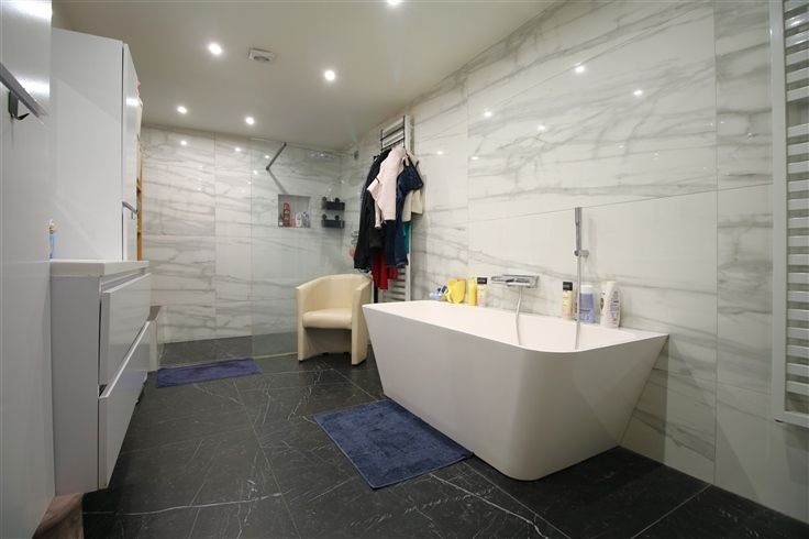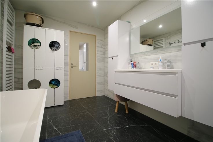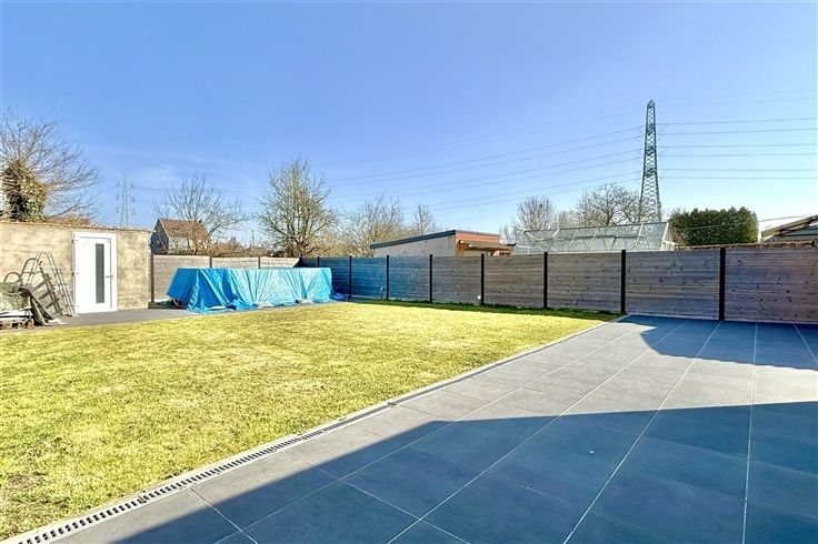 gelijkvloers: inkomhal, living, keuken, badkamer (bad, inloopdouche, meubel met 2 lavabo's), toilet, garage (41m²), buitenberging;
