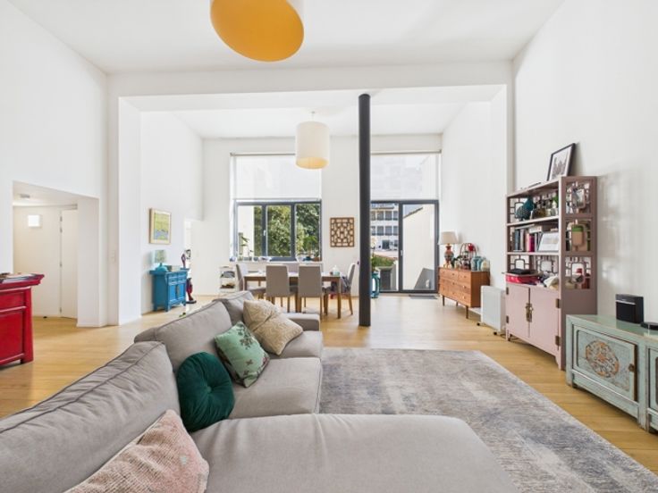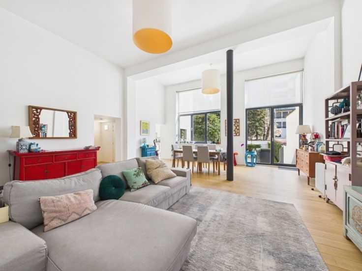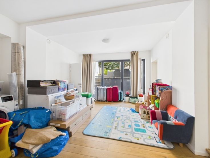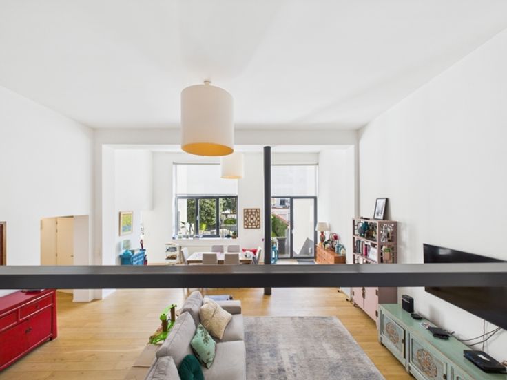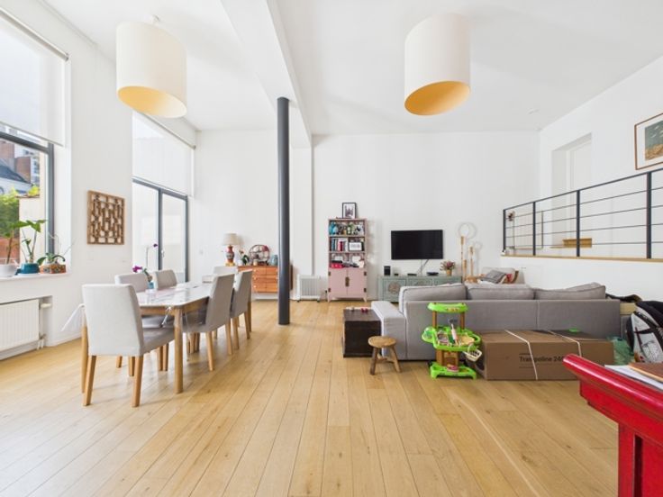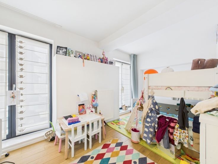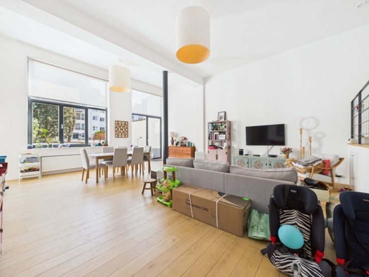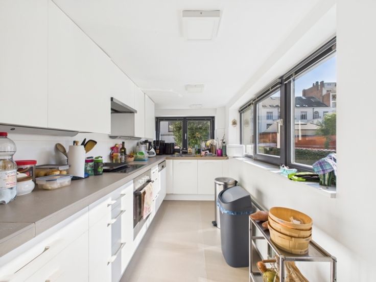 Hedendaagse stijl en afwerking, zeer lichte woonkamer, grote ramen, hoge plafonds, parketvloer, volledig ingerichte keuken (koelkast, vriezer, vaatwasser, Bosch elektrische kookplaat), videofoon, fietsenberging, lift, gasketel.
